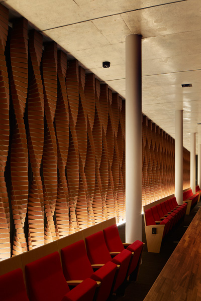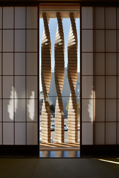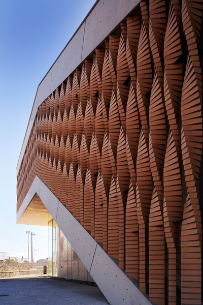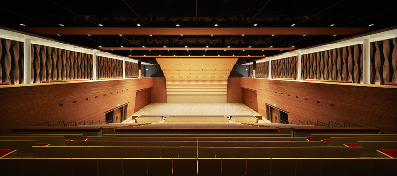 千葉県勝浦市に位置するコンサートホールを主体とする文化交流施設。外観開口部、およびホール内壁に、煉瓦を使用して意匠のポイントとすると同時に、外観では、外房の強い日射しを遮りながらも内部にやわらかな日射しを届けるルーバーとして、内壁ではその複雑な反射によって豊かな音色を生み出す装置として、それぞれ機能的な役割を担わせている。ねじりの方向、強弱により、多様な表情を醸し出すことのできる “ねじり積み” の採用によって、まるで布のような柔らかさを持つ新しい煉瓦の表情が姿を現した。