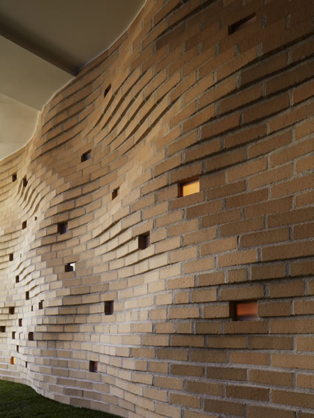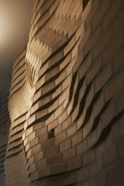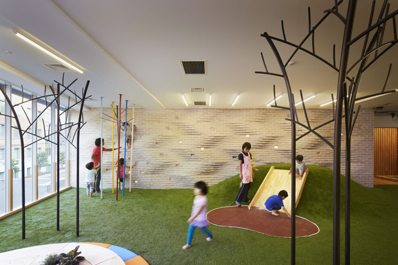 東京・飯田橋に位置する、幼稚園・保育園一体型のこども園。都心部のビル内において園児たちの運動場を確保するために、さまざまなアトラクションが用意されたフロアを用意。その一角に、クライミングウォール的な要素が加味された煉瓦壁が設えられた。インテリアのアクセントとしても機能する楽しげな煉瓦壁には、LEDライトが仕込まれた穴が穿たれ、計算された凹凸を手がかり・足がかりに子供たちが縦横に移動する。機能と装飾が一体となった煉瓦ならではの特殊壁が現出されている。