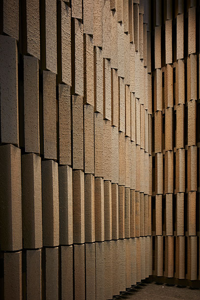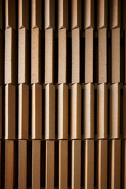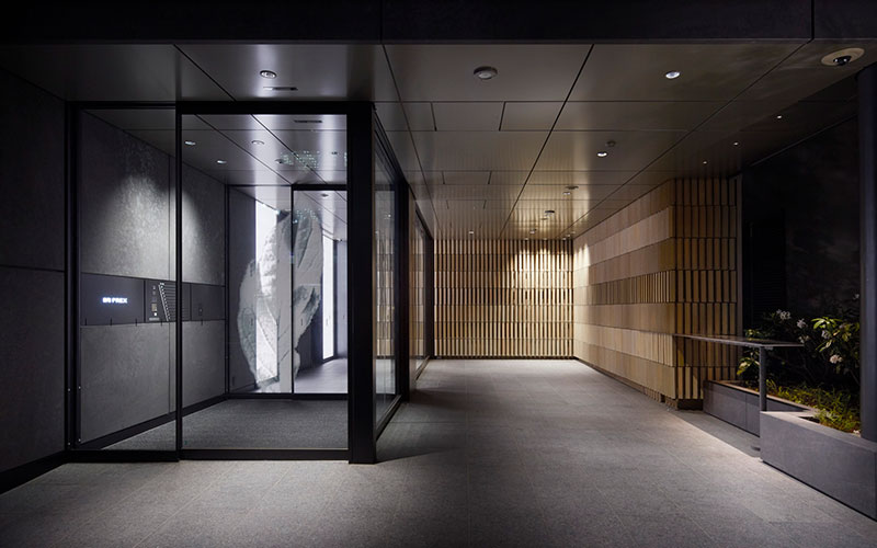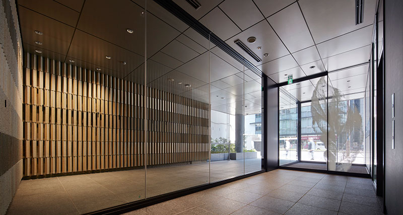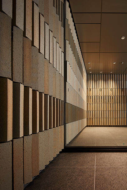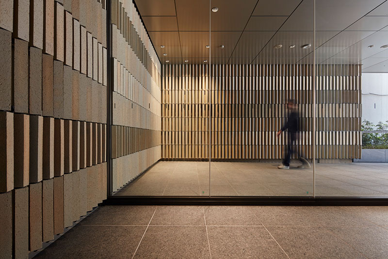 千代田区麹町新宿通り沿いに位置するオフィスビル。江戸文化の縦格子をイメージし、スレンダーな煉瓦を縦積みにして構成されている。日中はオープンカフェが出店しオフィスワーカーで賑わう。