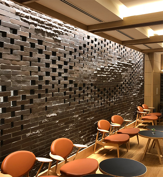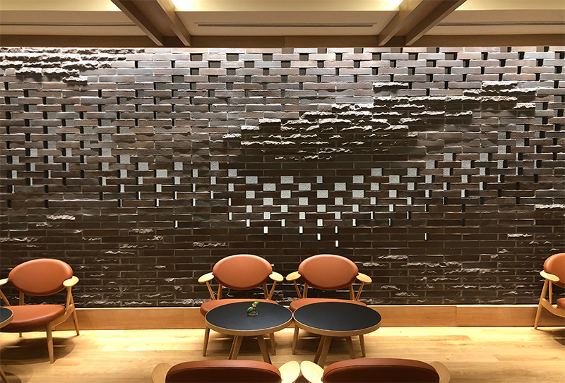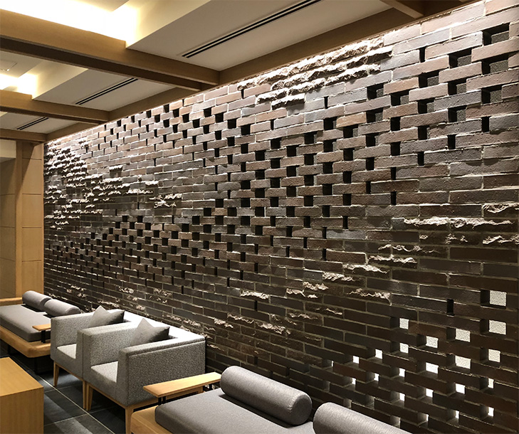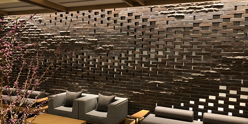 箱根町強羅に位置するラグジュアリーホテルのロビーラウンジの壁面にレンガアートを製作。手斫りによる割肌煉瓦と組み合せ、強羅の山々と早川の清流をデザインしている。